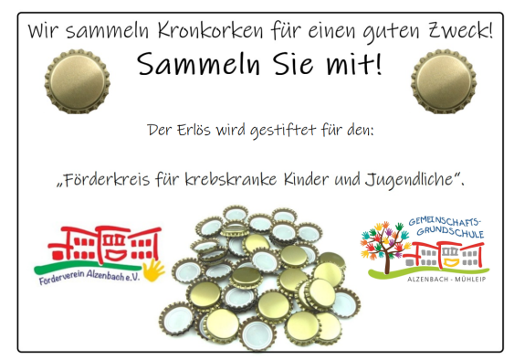 Wir haben im Foyer der Schule einen großen Sammelbehälter aufgestellt. Bitte unterstützen Sie die Aktion und geben Ihrem Kind bei Ihnen anfallende Kronkorken mit!